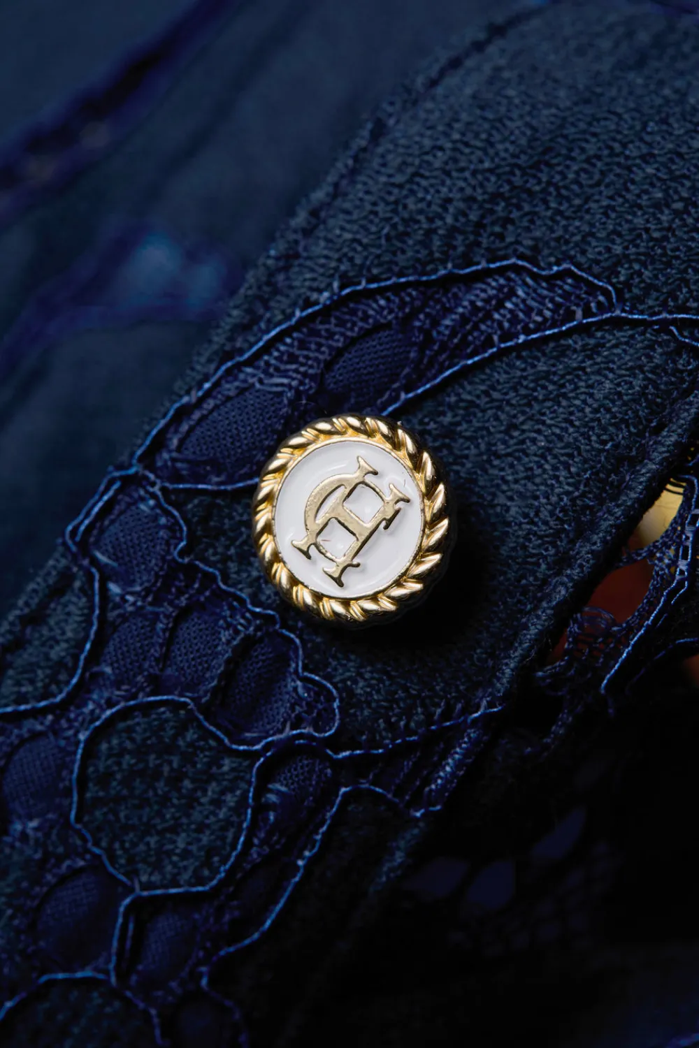Crafted from a large-scale floral cotton blend lace, the dress is fully lined through the lower body and skirt for effortless wearability. Thoughtful details like princess seams, a self-fabric belt at the waistline, and a button-down placket with signature gold enamel buttons enhance its tailored finish.