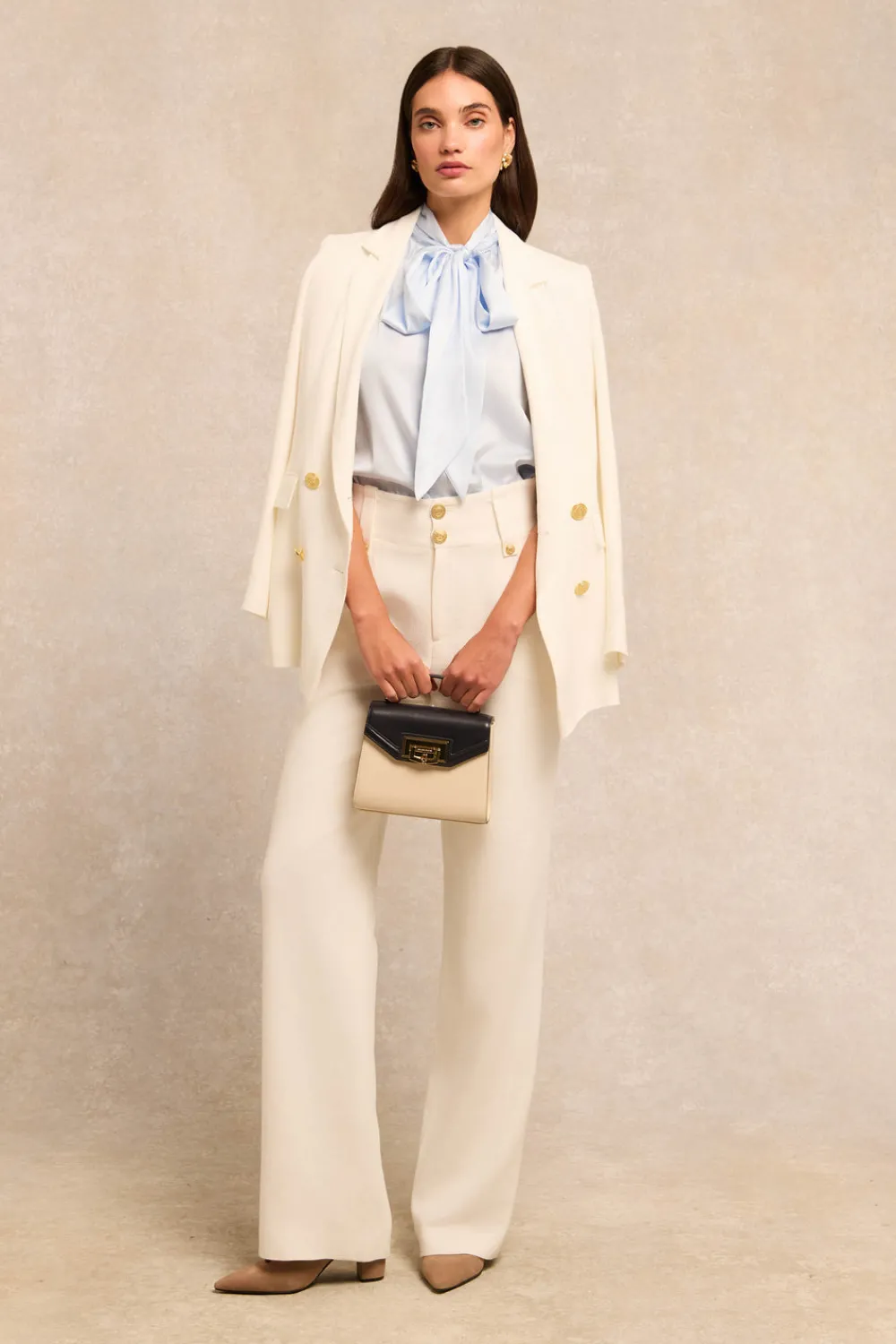 Designed with a fluid drape with a statement oversized bow collar, this blouse has been beautifully created from an elegant satin fabric. Curated to be fitted on the shoulders with a looser fit through the body. Detailed with our iconic gold hardware & HC branding to the back yolk.
