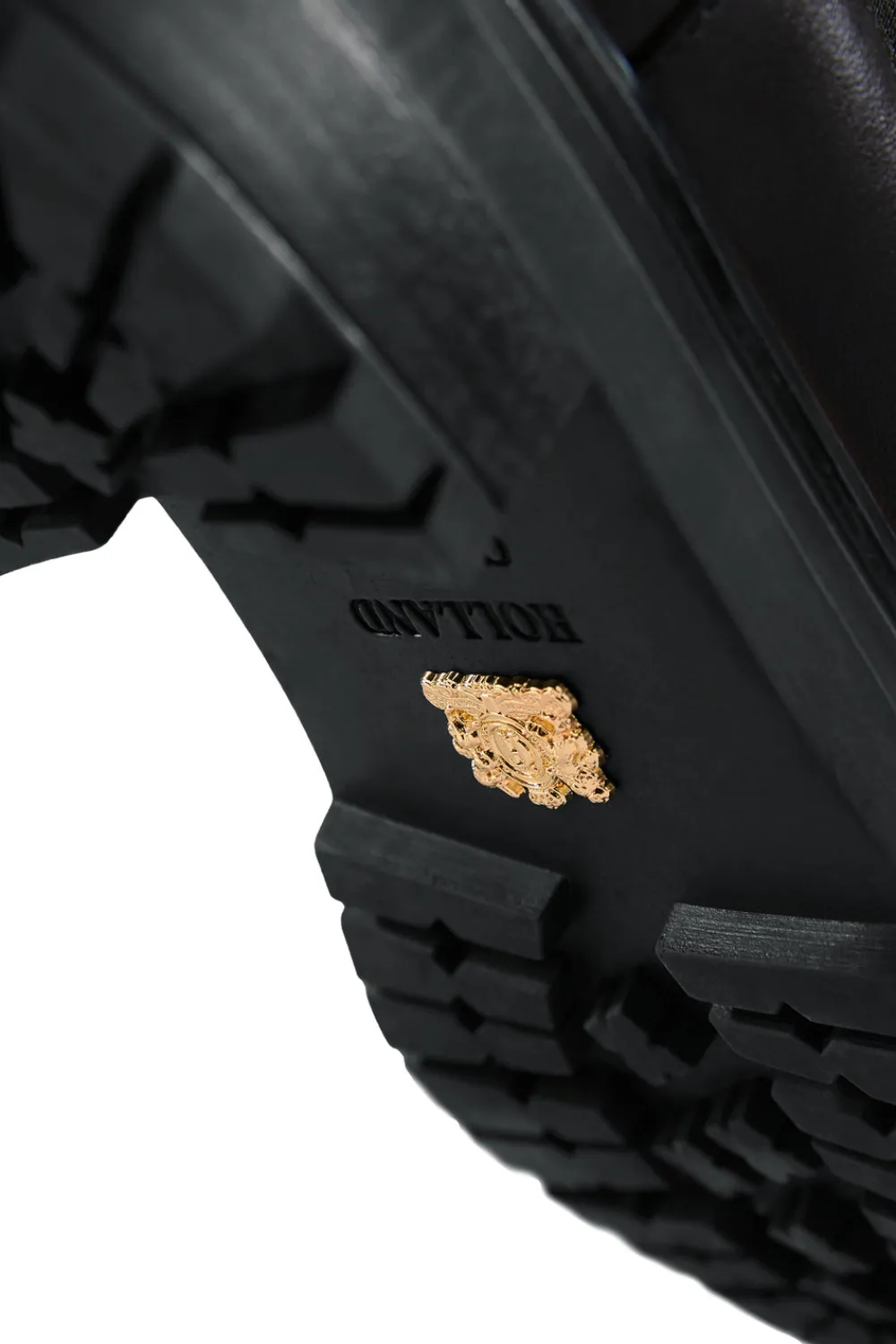 The epitome of minimalist chic, this classic knee boot has been inspired with a subtle touch of our equestrian heritage. Created from a premium leather with matching lining. Designed with a classic almond toe with a chunky tracked sole, this boot ensures a comfortable & stylish wear. Subtly detailed with a delicate HC pin.