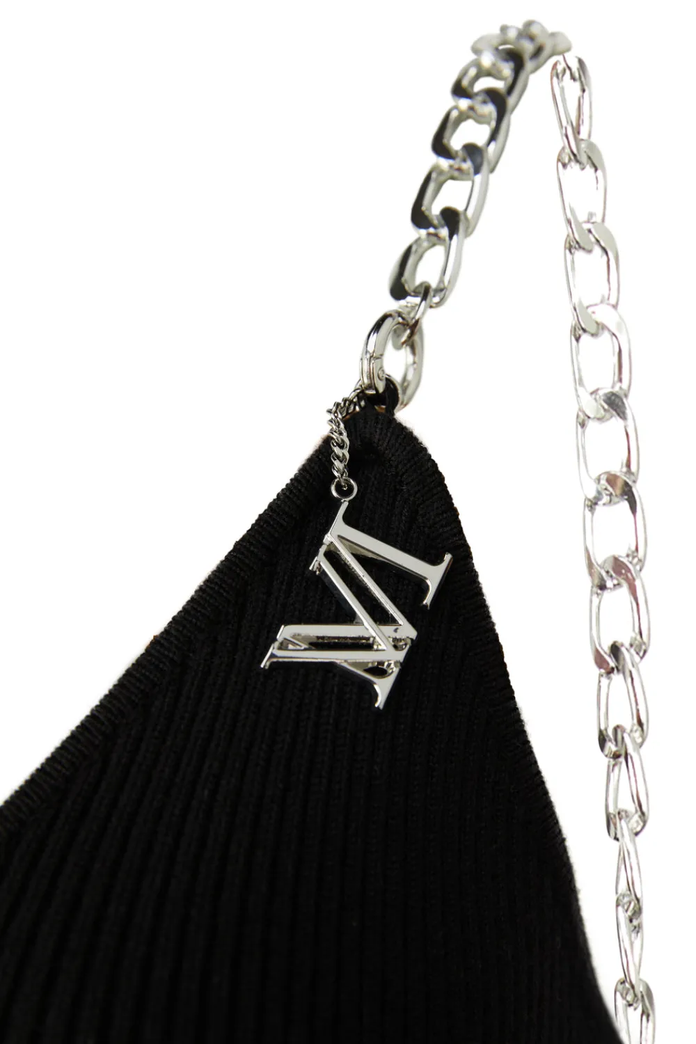 Made from a super soft, sculpting ribbed material this dress is the perfect evening dress. Designed with a romantic sweetheart neckline with silver chain straps, this dress is both elegant and sophisticated. With a mid-length cut and a figure-hugging body, this is sure to become a wardrobe staple.