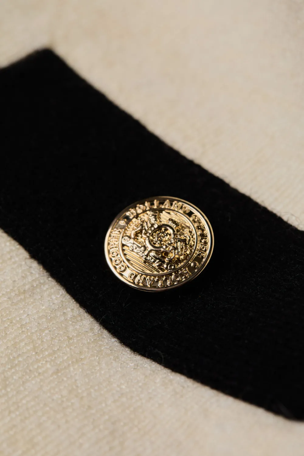 Featuring exquisite contrast detailing and a striking stripe at the hem and cuffs adds a touch of sophistication. The classic crew neck provides a clean and versatile silhouette, while the gold rivets introduce a subtle hint of glamour, making this cardigan a perfect choice for both casual and more elevated occasions.