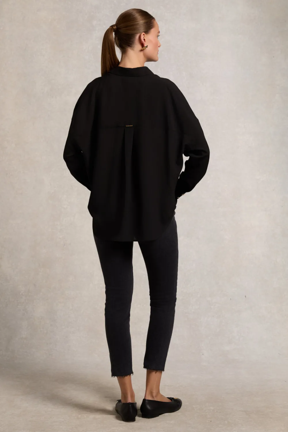 Designed with an oversized fit and dropped shoulder styling with box pleat details, this shirt ensures a comfortable fit. With a dropped back and curved hem, this lightweight crepe fabric provides an elegant drape. Detailed with a single white button at the neck closure and elevated with tonal embroideries and our signature hardware.