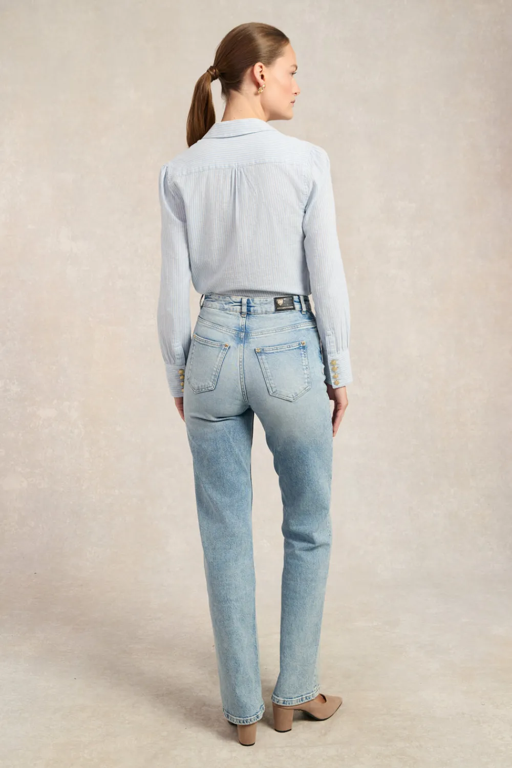 Crafted from lightweight cotton and boasting preppy-style stripes, this shirt combines a relaxed fit with a touch of sophistication. Featuring subtle details, the small embroidery on the front chest and our signature gold metal hardware elevate this traditional style.