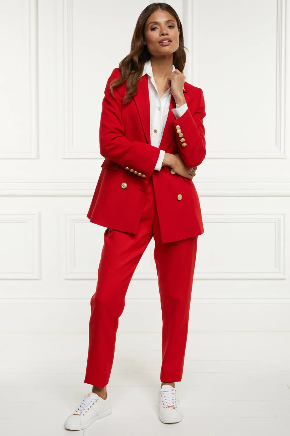 This longline double breasted wool blazer is a chic trans-seasonal forever wardrobe essential. Designed to create a sharp tailored silhouette worn open or closed. Fully lined with a luxury stretch lining for extra comfort and adorned with HC signature gold buttons on the front and cuffs. This blazer has been hand cut and made entirely in England using wools woven in the UK.
