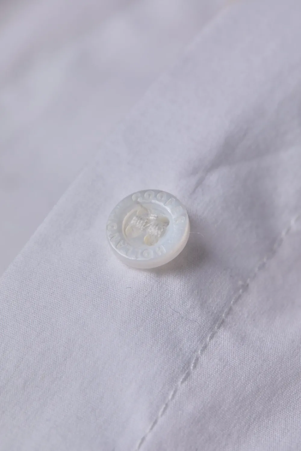 Elevate your wardrobe essentials with our exquisitely crafted Eleanor Shirt. This refined piece showcases a relaxed, boxy silhouette crafted from premium cotton blend fabric, ensuring both comfort and sophistication. Featuring our signature HC embroidery on the front patch pocket in distinguished navy, this shirt epitomises understated British luxury. The box pleat back yoke ensures a flattering fit, while engraved poly buttons and our iconic gold-finished cuff buttons add those quintessential finishing touches. The slightly cropped length offers versatile styling options for the modern wardrobe.