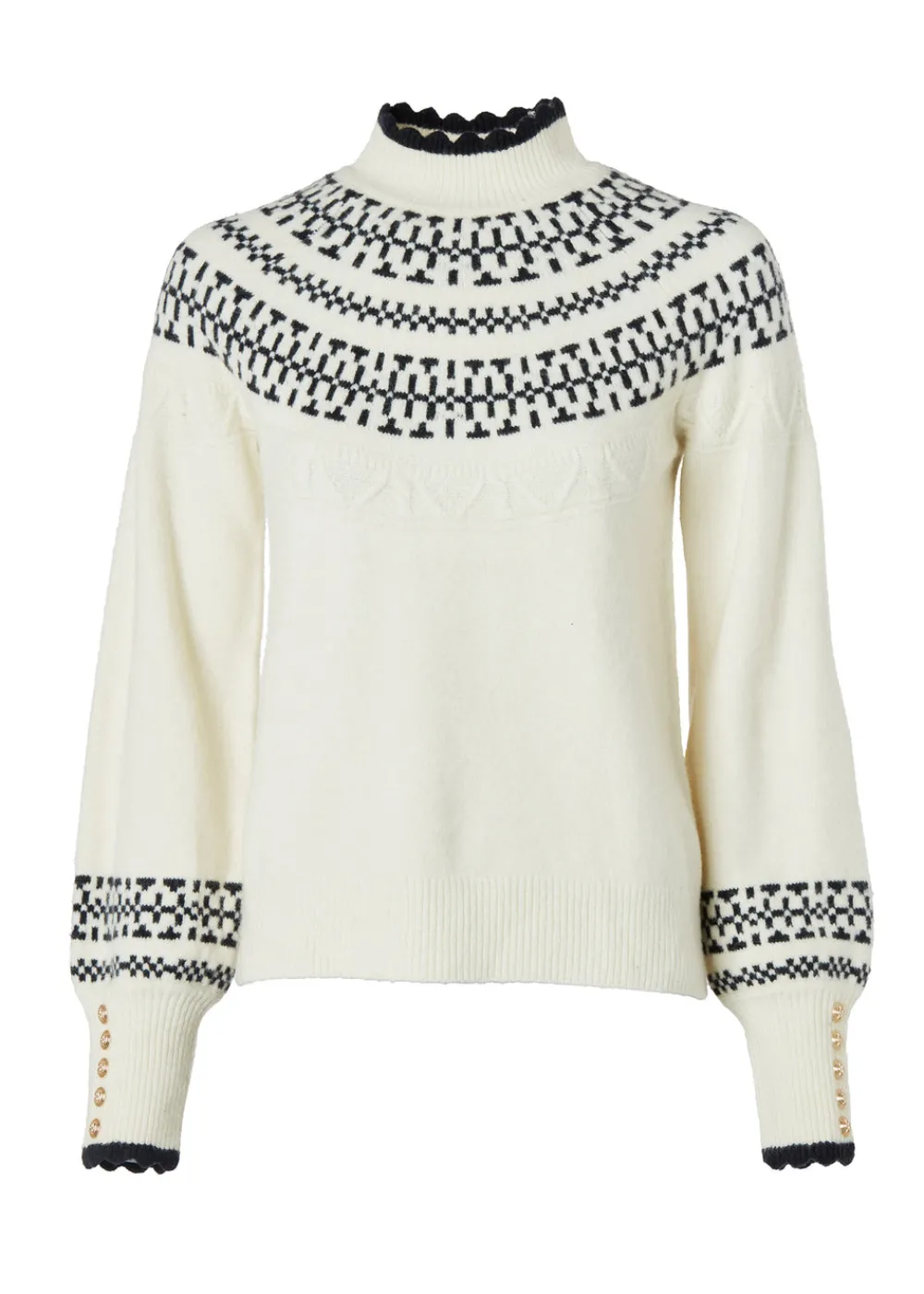The Elodie Roll Neck Knit combines timeless style with intricate detailing. Featuring a classic Fair Isle pattern with cable detailing and voluminous, feminine raglan sleeves , this knit offers a cozy, yet refined look. The roll neck is accented with contrast scallop edging, adding a unique touch, while signature hardware on the cuffs completes the piece with a touch of sophistication. Ideal for layering or wearing on its own, this knit is a perfect blend of comfort and elegance.
