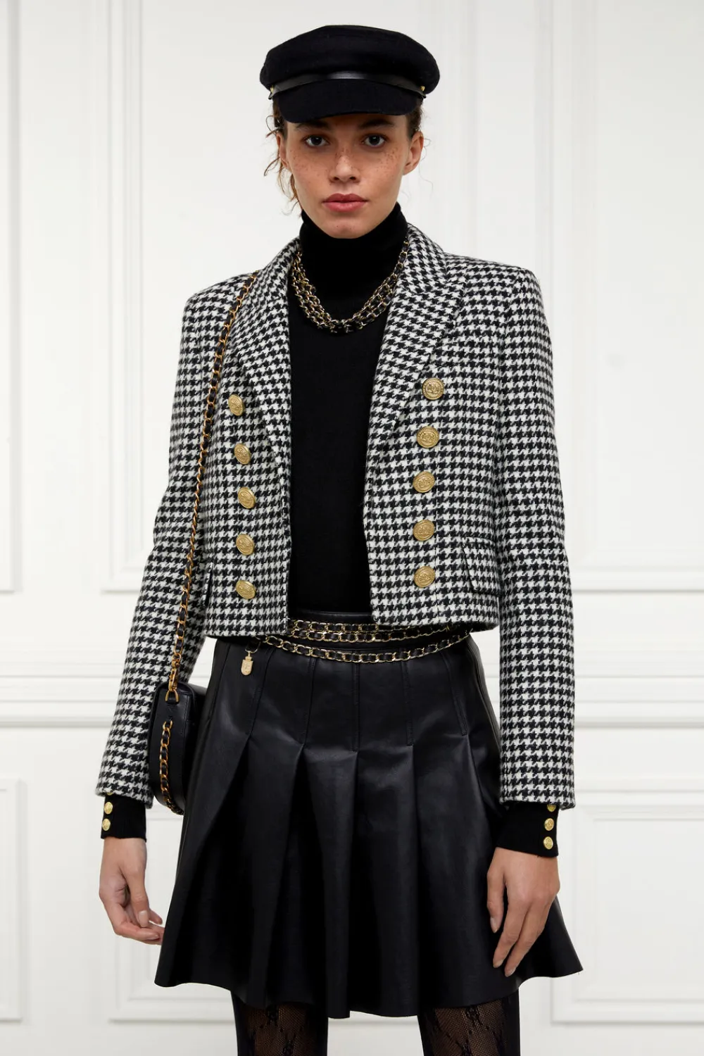 Introducing our vintage-inspired pleated mini skirt, a chic and modern twist on a timeless classic. This mini skirt features elegant knife pleats all around, offering a playful yet sophisticated silhouette. Crafted from super supple and soft faux leather fabric with a refined grain effect, it provides luxurious comfort and style. The extra thick leather topstitching adds durability and a touch of boldness, while the signature gold metal hardware elevates the overall design. Perfect for making a statement, this skirt is a versatile piece that seamlessly blends vintage charm with a modern edge.