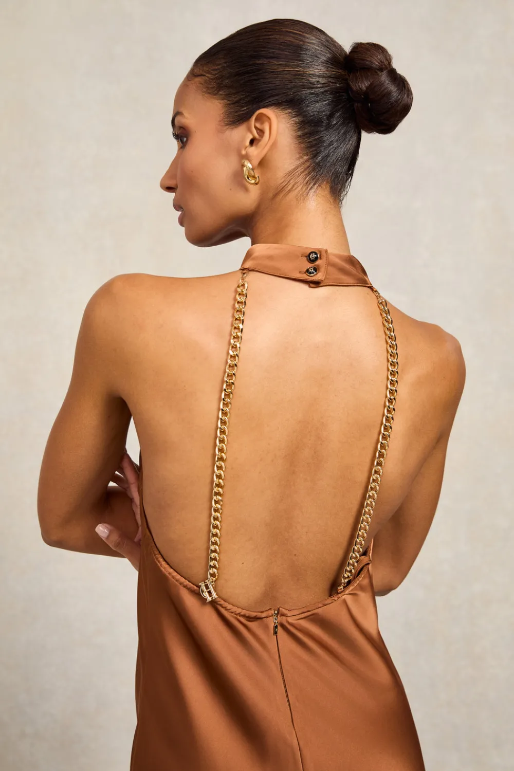 Both statement & elegant, this open-back dress has been beautifully created from a soft, satin fabric. With a halter neck shape with gold chain detailing, the longer-length design ensures a feminine silhouette. Detailed with a modest single side split & finished with a delicate HC charm.