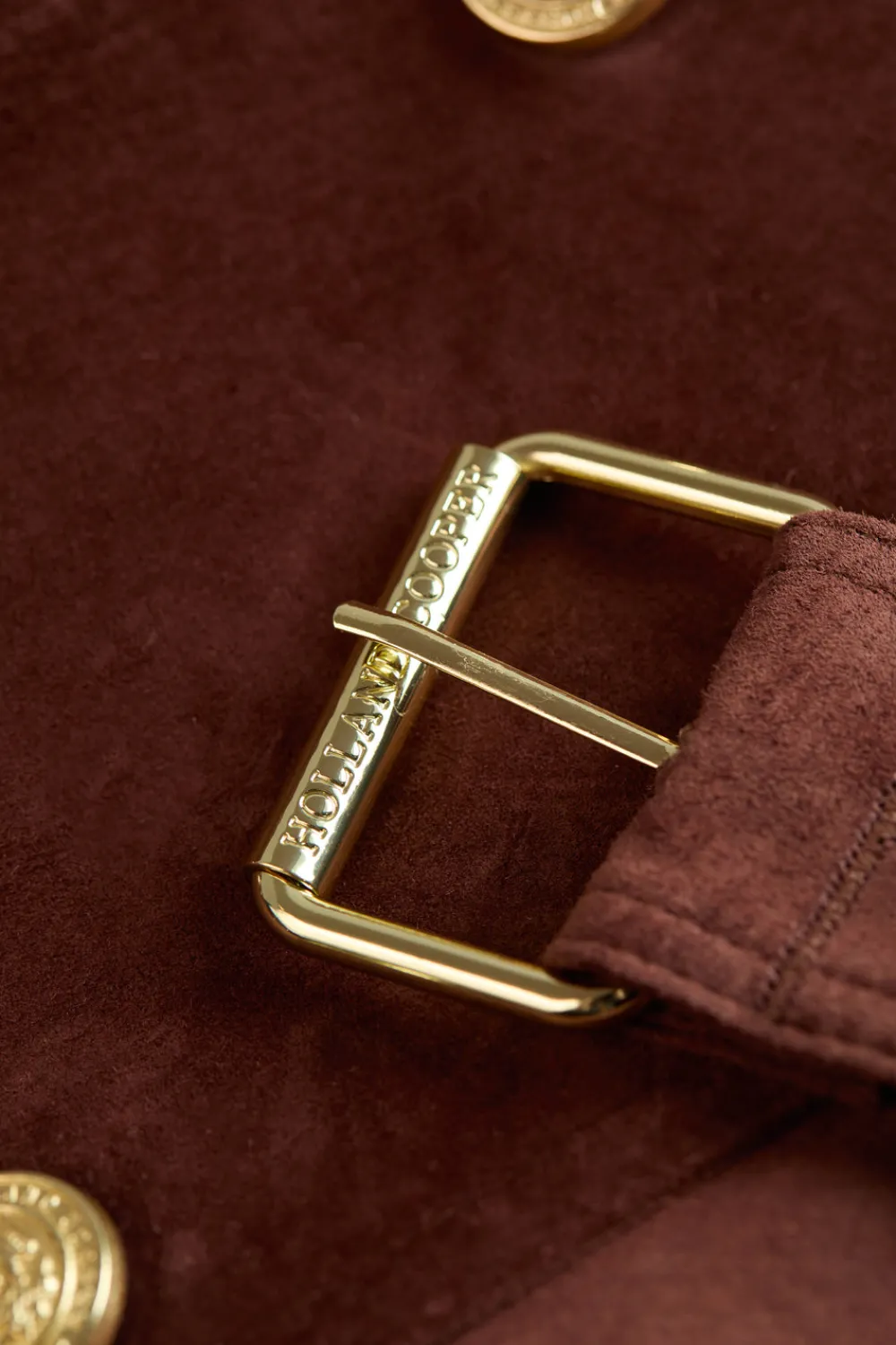 - Double-breasted front with buckle-fastened belted waist