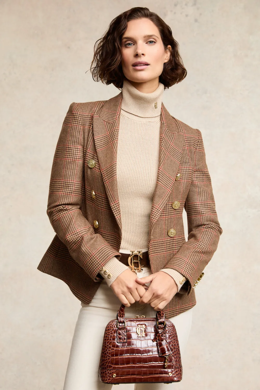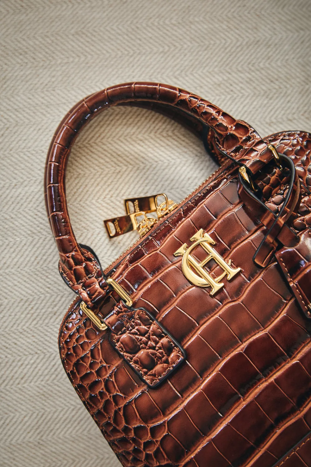 A small classic kettle-shaped top handle bag crafted from premium croc-embossed cow leather. This elegant accessory is fully branded with our iconic gold details, adding a touch of luxury to its timeless design. It features a long, detachable shoulder strap with a fully branded buckle and tip edge for versatile styling. The bag is thoughtfully designed with a key charm, an internal zip pocket, and a card holder, combining functionality with sophistication.