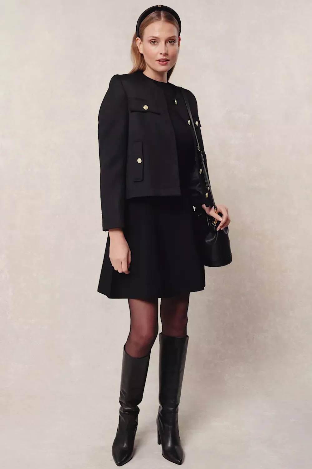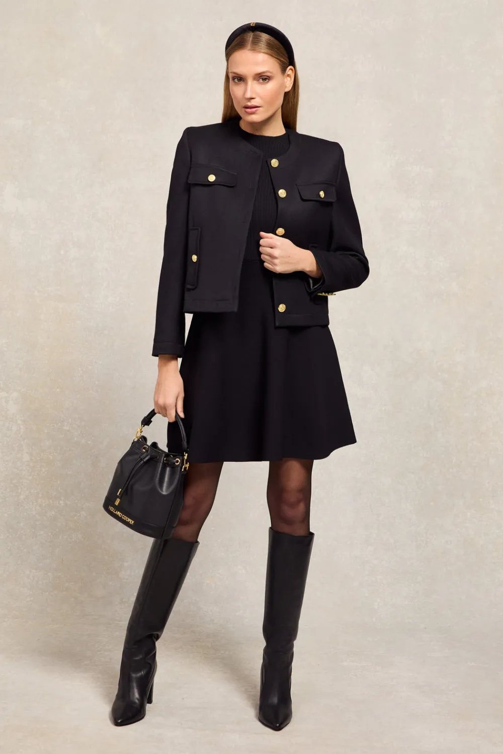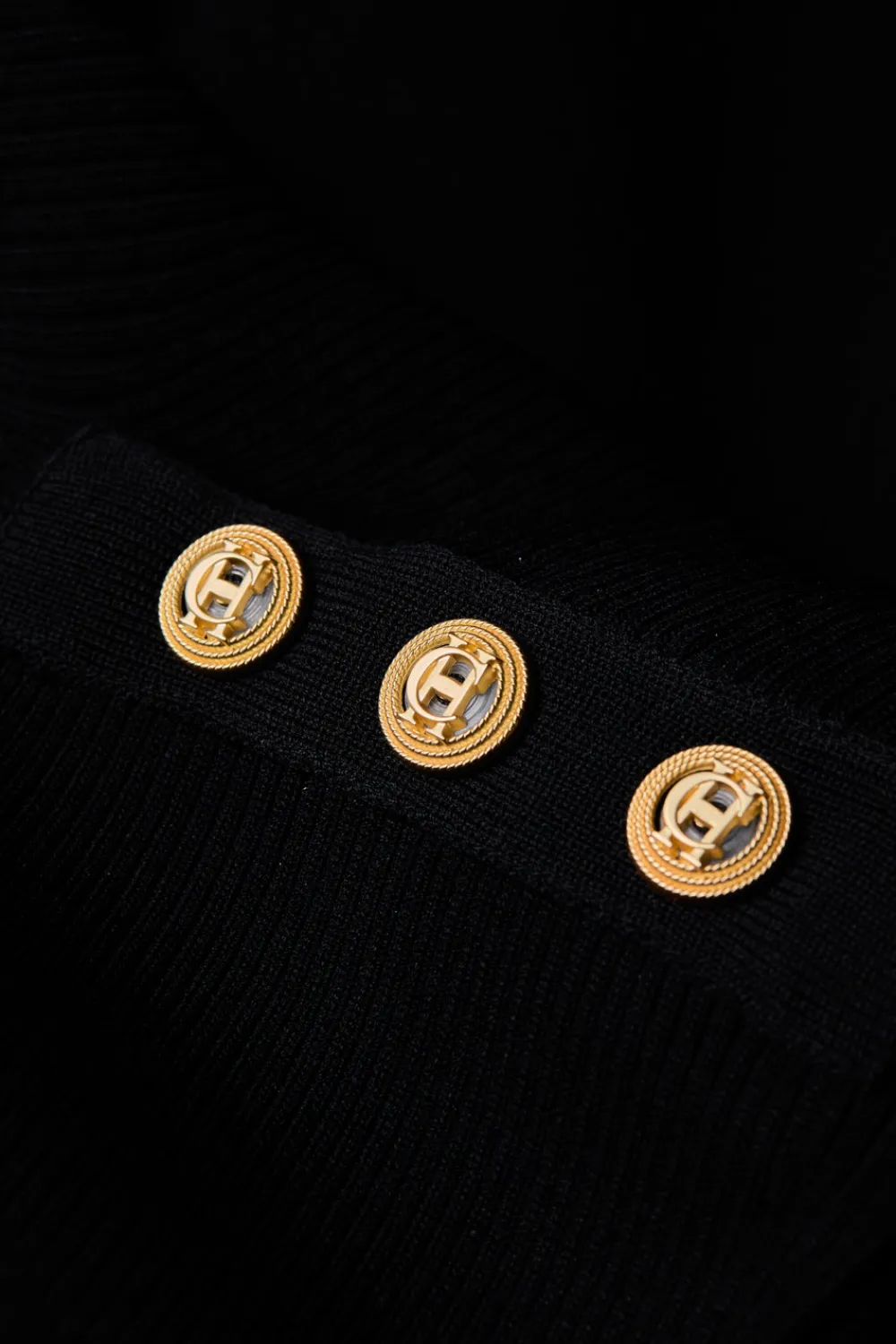 A perfect blend of elegance and edge. Designed with lightly padded shoulders and a flattering ribbed knit, this mini dress creates a striking silhouette. Featuring a high neckline and signature HC gold hardware, it’s a versatile piece that effortlessly transitions from day to night.