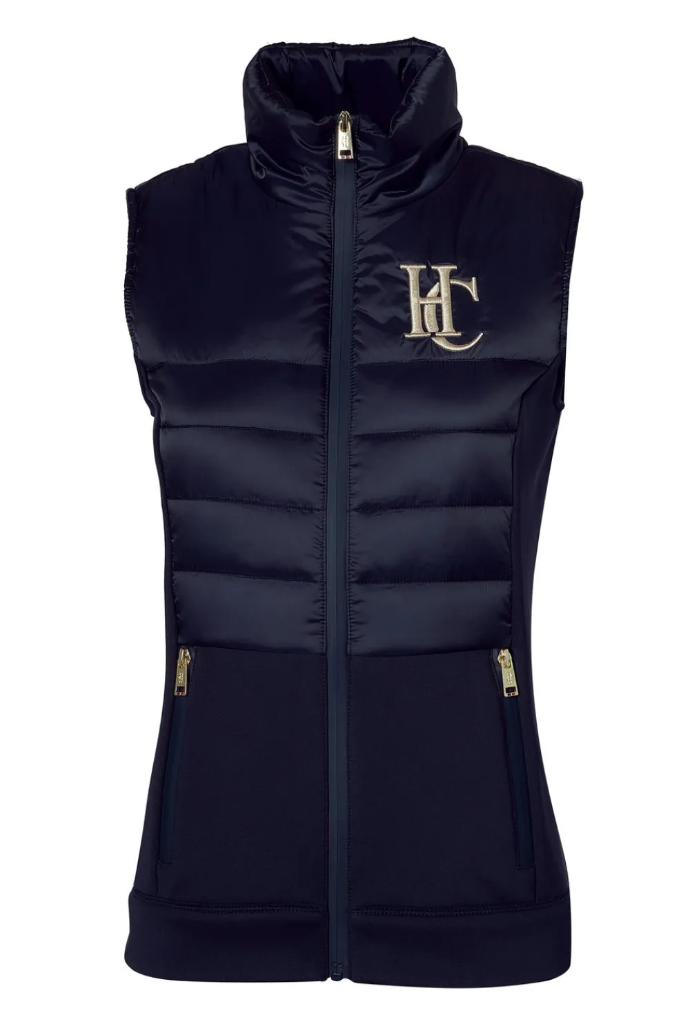 This gilet features a padded upper filled with Sorona™ for superior warmth. The high-density poly-nylon shell fabric ensures durability, while the performance jersey body enhances breathability and movement. Stay dry with waterproof zips on the front pockets and a coated zip closure. The high build embroidery on the back adds a touch of sophistication.