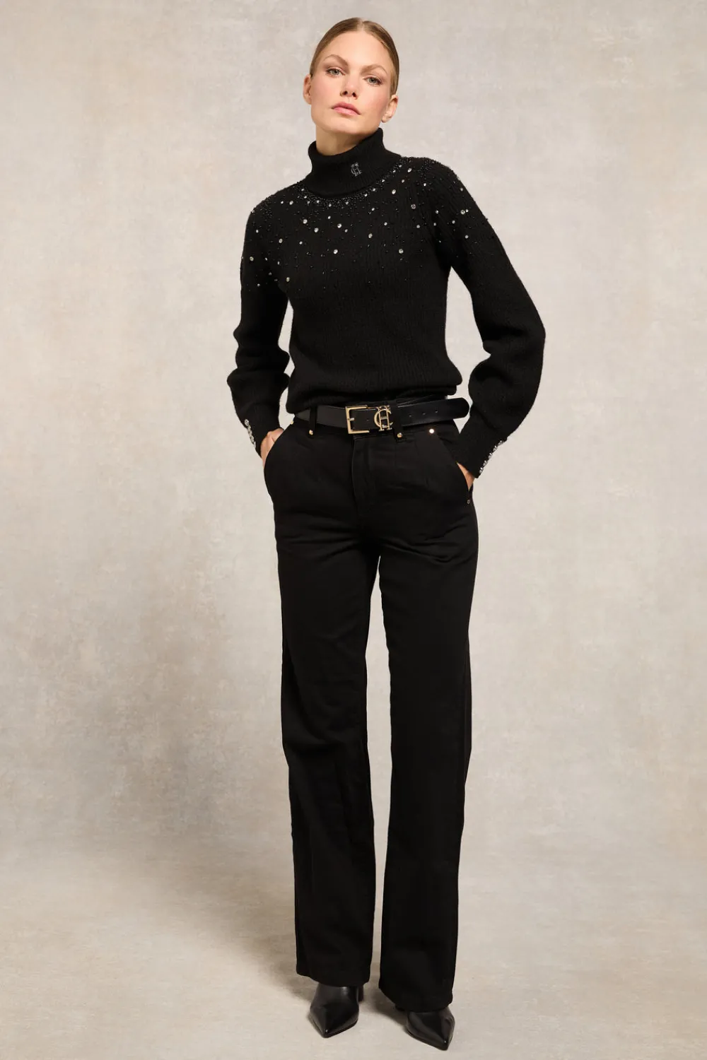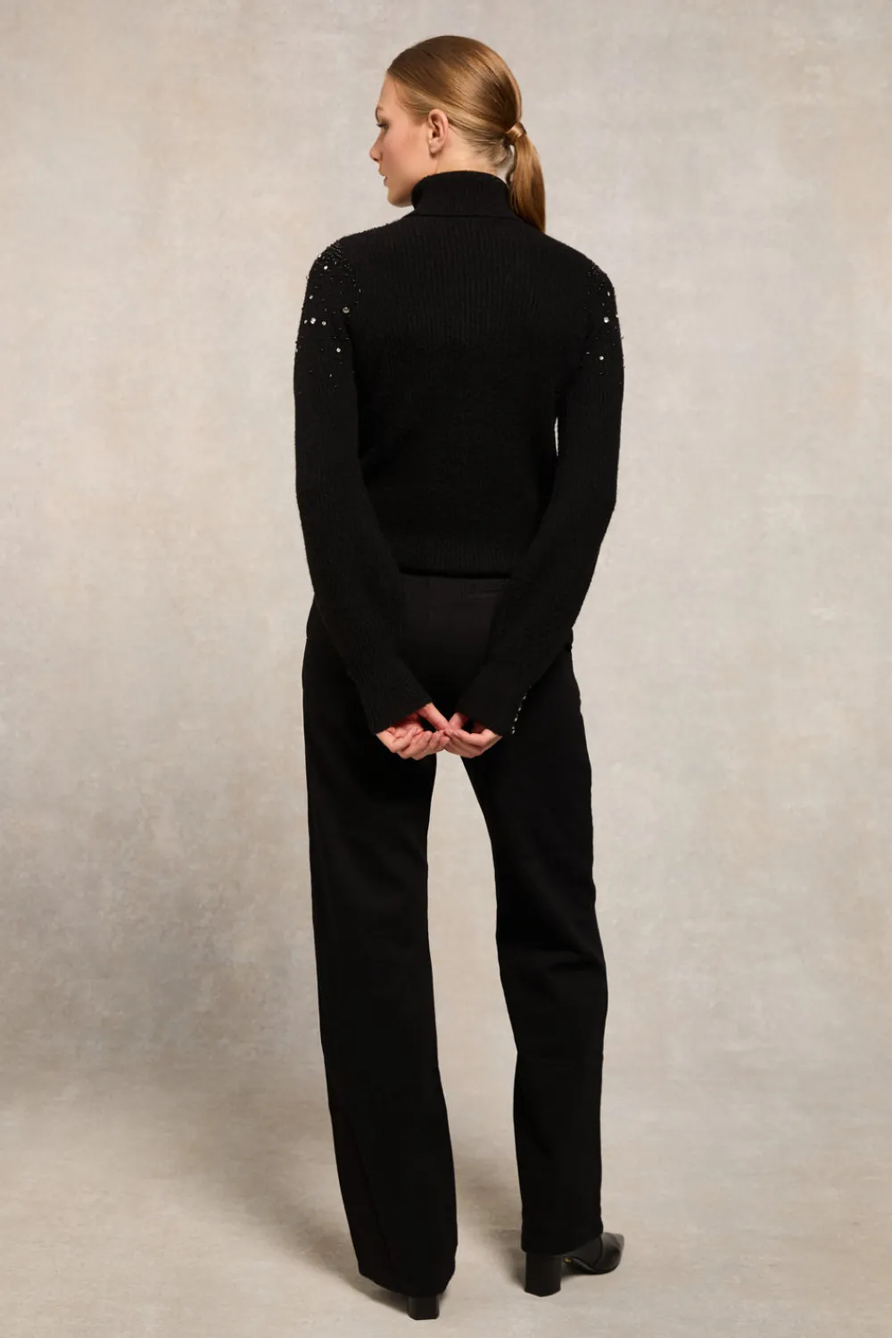 A sophisticated wardrobe essential, crafted from soft, ribbed fabric for a flattering fit. The Kelsie Rib Embellished roll neck is elegantly adorned with crystal and pearl detailing, adding a touch of glamour, while signature hardware on the cuffs offers a luxurious finish. Perfect for elevating both day and night looks, this piece effortlessly combines comfort and style.