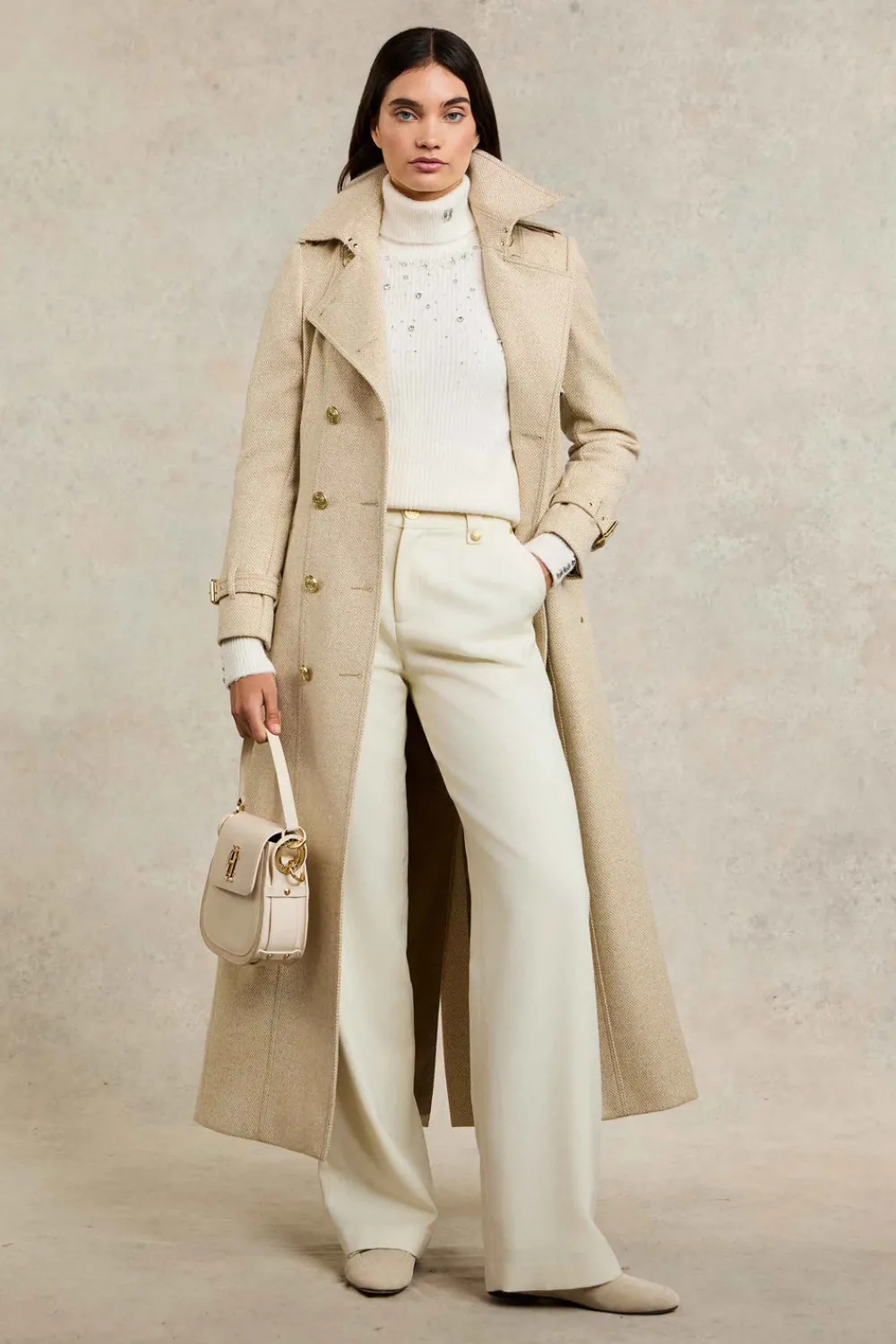 A sophisticated wardrobe essential, crafted from soft, ribbed fabric for a flattering fit. The Kelsie Rib Embellished roll neck is elegantly adorned with crystal and pearl detailing, adding a touch of glamour, while signature hardware on the cuffs offers a luxurious finish. Perfect for elevating both day and night looks, this piece effortlessly combines comfort and style.