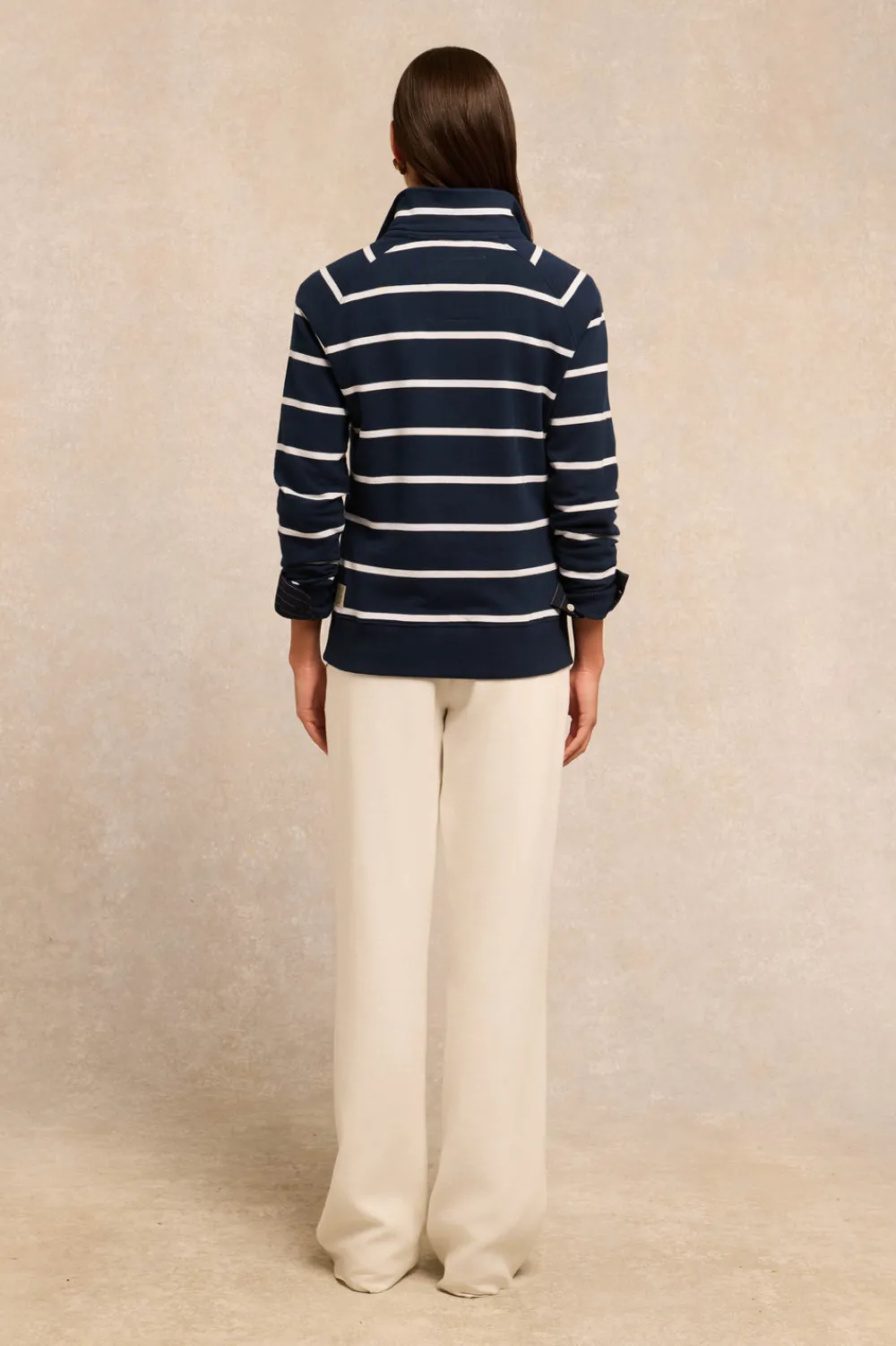 The Kingham Quarter Zip Sweat is crafted from soft cotton loopback jersey for all-day comfort with a premium feel. Featuring classic breton stripes, this piece blends heritage influence with contemporary style. The ¼ zip neckline allows for versatile layering, while the contrast chest embroidery adds a refined touch of branding.