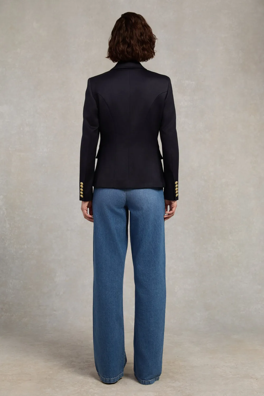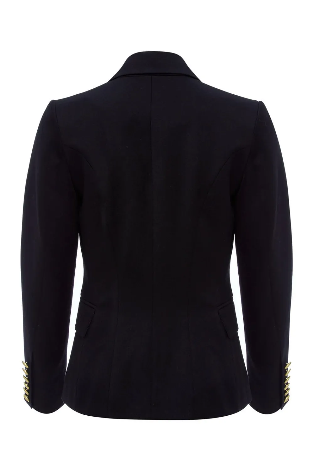 This double breasted Blazer is a chic transeasonal wardrobe essential. Designed to create a sharp tailored silhouette worn open or closed. Fully lined with a luxury stretch lining for extra comfort and adorned with HC signature Gold buttons on the front and cuffs. This blazer has been hand cut and made entirely in England using wools woven in the UK.