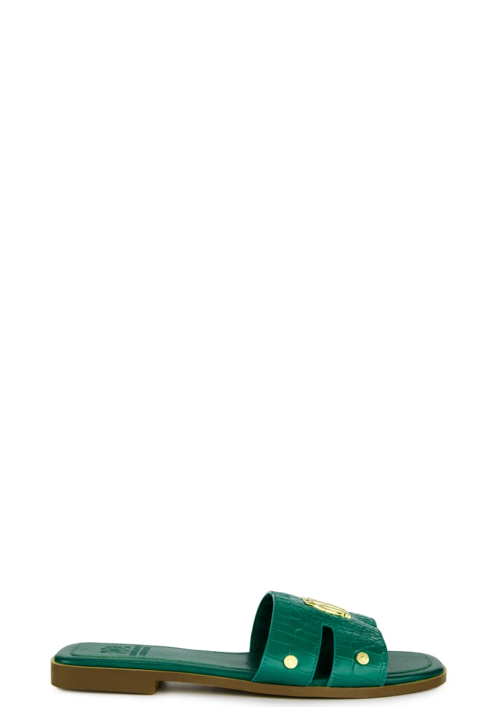 Meet our new shade of Monogram Slides, Jade Croc, the perfect accompaniment for summer. Designed with a cushioned sole for comfort, soft leather strap and eye catching cut out detail. This slide is adorned with our signature HC Monogram and gold rivets.