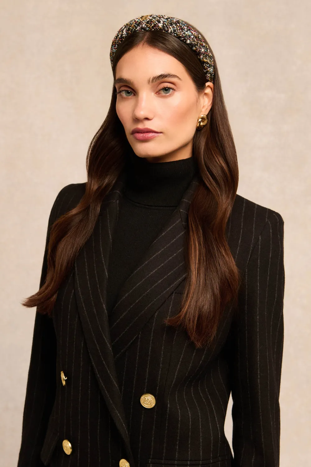 This refined piece showcases our signature attention to detail, crafted with a luxurious bouclé fabric that catches the light with subtle sparkle. The narrow, padded silhouette offers both elegance and comfort, while the internal grosgrain ribbon ensures a secure fit. Adorned with our distinguished HC pin, this headband epitomises luxury.