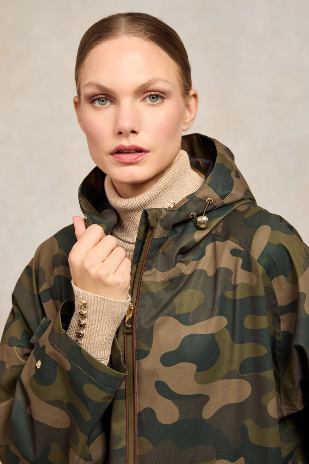 Elevate your outerwear with our signature One-Size Lightweight Waterproof Coat in Camo. Crafted from premium polyester twill, this refined iteration of our coveted design offers the same impeccable silhouette with a lighter feel. The coat features our distinctive diamond-quilted taffeta lining, adorned with our iconic monogram print. Perfect for the discerning woman who demands both functionality and elegance, this waterproof essential combines British heritage with contemporary luxury.