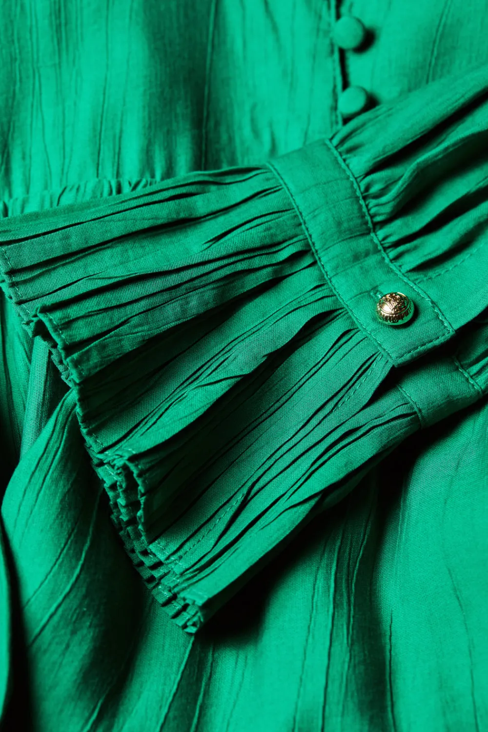Designed with a maxi length, this dress features a modest v-neckline with self-covered buttons at the centre front for a touch of elegance. Delicate sleeve details and fluted cuffs add a subtle charm, while the elasticated shirred back panel ensures a perfect fit. Designed for convenience, this dress comes with a fully lined skirt and side-entry pockets. The signature gold hardware at the cuffs adds a hint of sophistication.