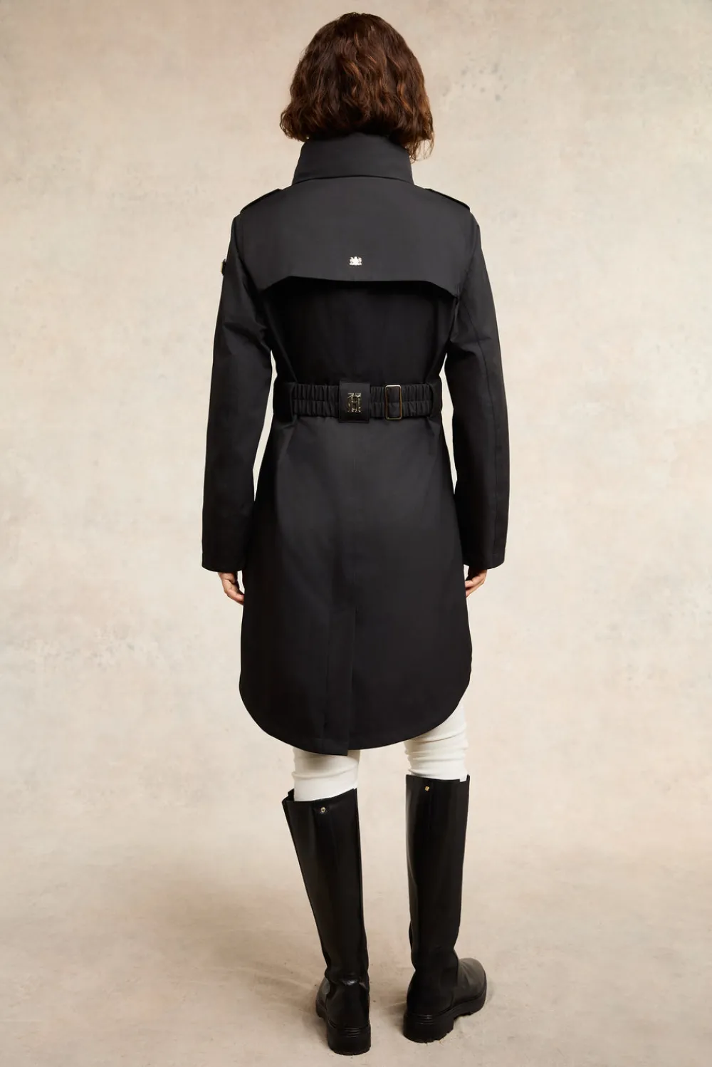 Featuring a fabric covered elastic belt with a sophisticated tortoiseshell buckle closure, combining elegance with practicality. The storm plackets with signature gold snap fastenings and front yoke details add a touch of refinement, while the detachable hood offers versatility. The double strap fastening on the cuffs provides a secure fit, and the HC monogram on the back belt loop adds a signature finish.