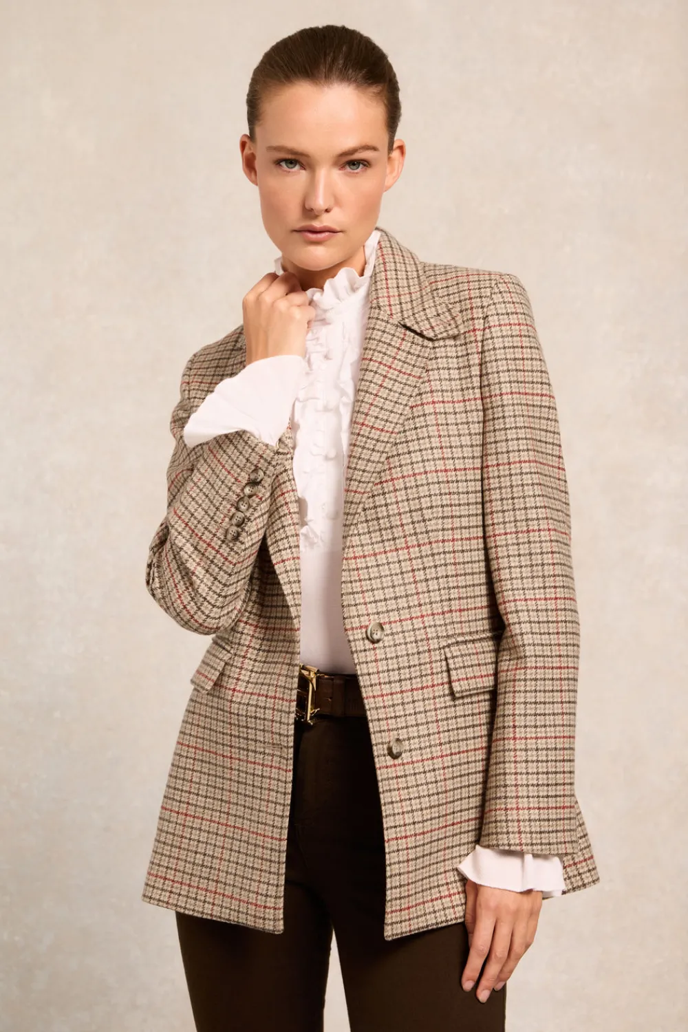 This is a modern and elegant version of a traditional country-style blazer. Made from durable, British-made wools and trimmed with authentic suede. Complete with stretch lining for extra movement, single back vent, storm collar tab and trimmed with branded HC faux horn buttons. Wear it solo or layered over one of our shirts or signature pieces of knitwear. This product has been hand cut and made entirely in the UK.