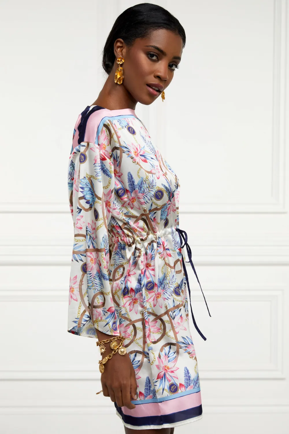 Designed with a chic, mini-length with statement bell sleeves, this dress is a must-have for the season. With a relaxed fit, the tie waistband allows for an adjustable fit. Elevated with a hand-drawn print across the silhouette.