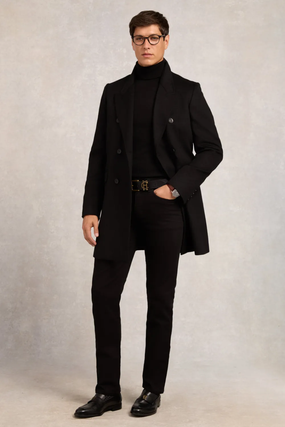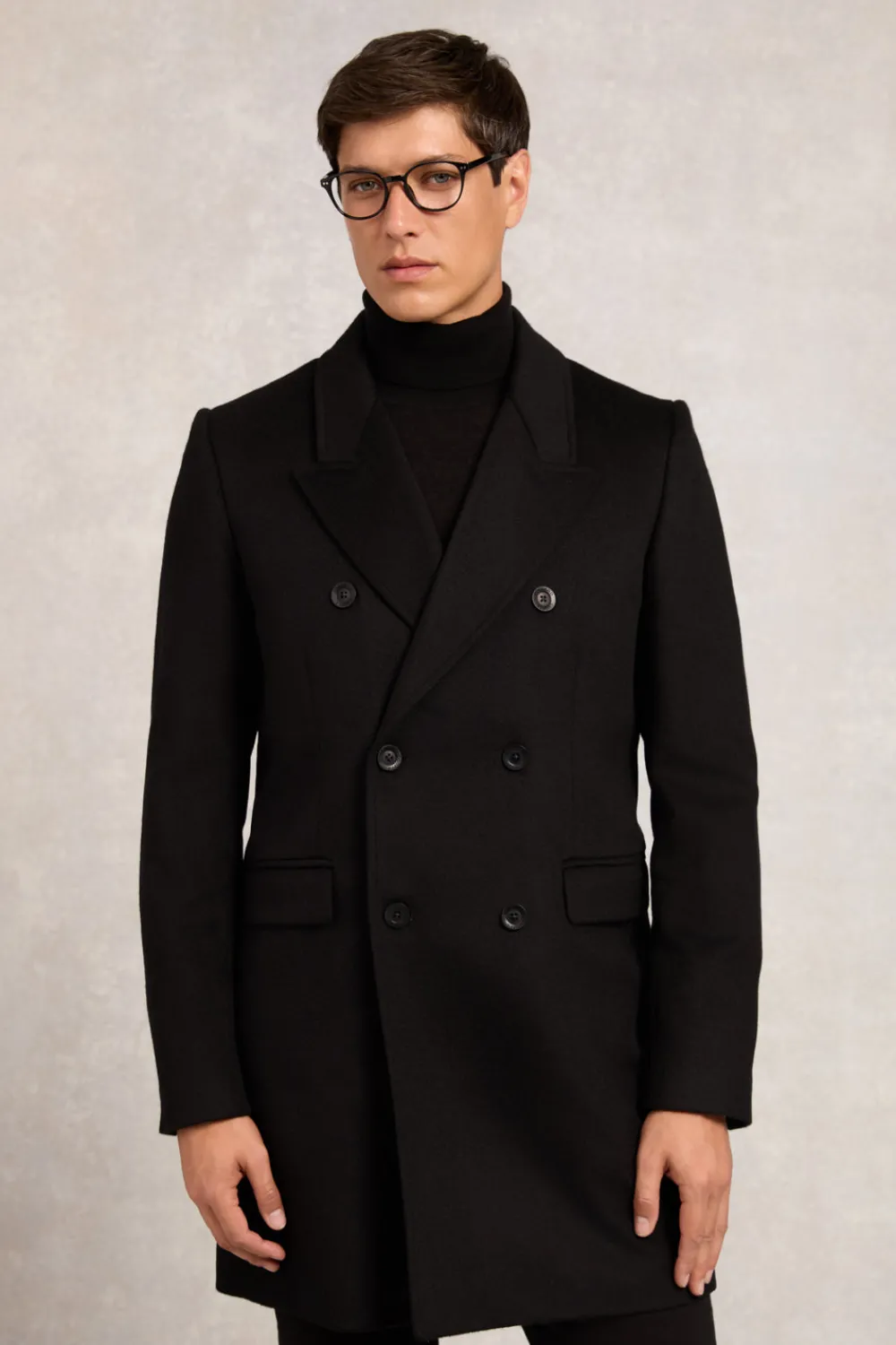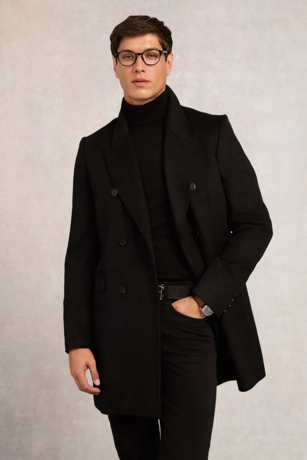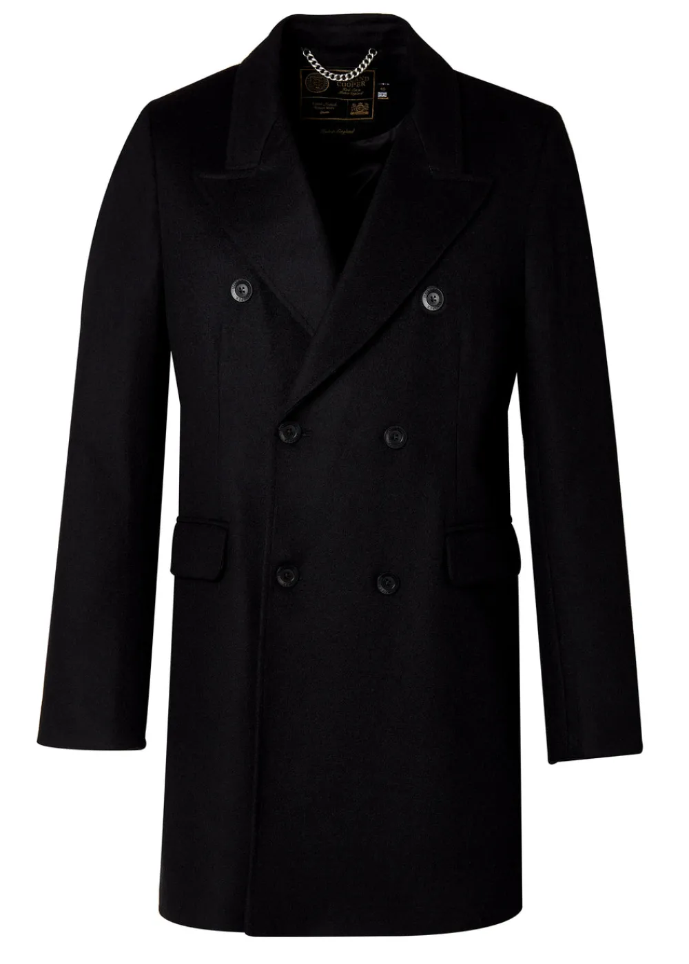Hand crafted in the UK using the finest wools and meticulously tailored for a crisp, clean appearance, the Double Breasted Coat is the epitome of classic tailoring. With a mid-length silhouette and double breasted, button closure, this coat is framed by slightly padded shoulders for a sharp fit. Tailored with articulated sleeves and classic notch lapels, the double-welt pocket detail has been elevated with a mock horn button closure. Finished with a contrasting under collar for a statement wear with practical chain hanger loop on the inside.
