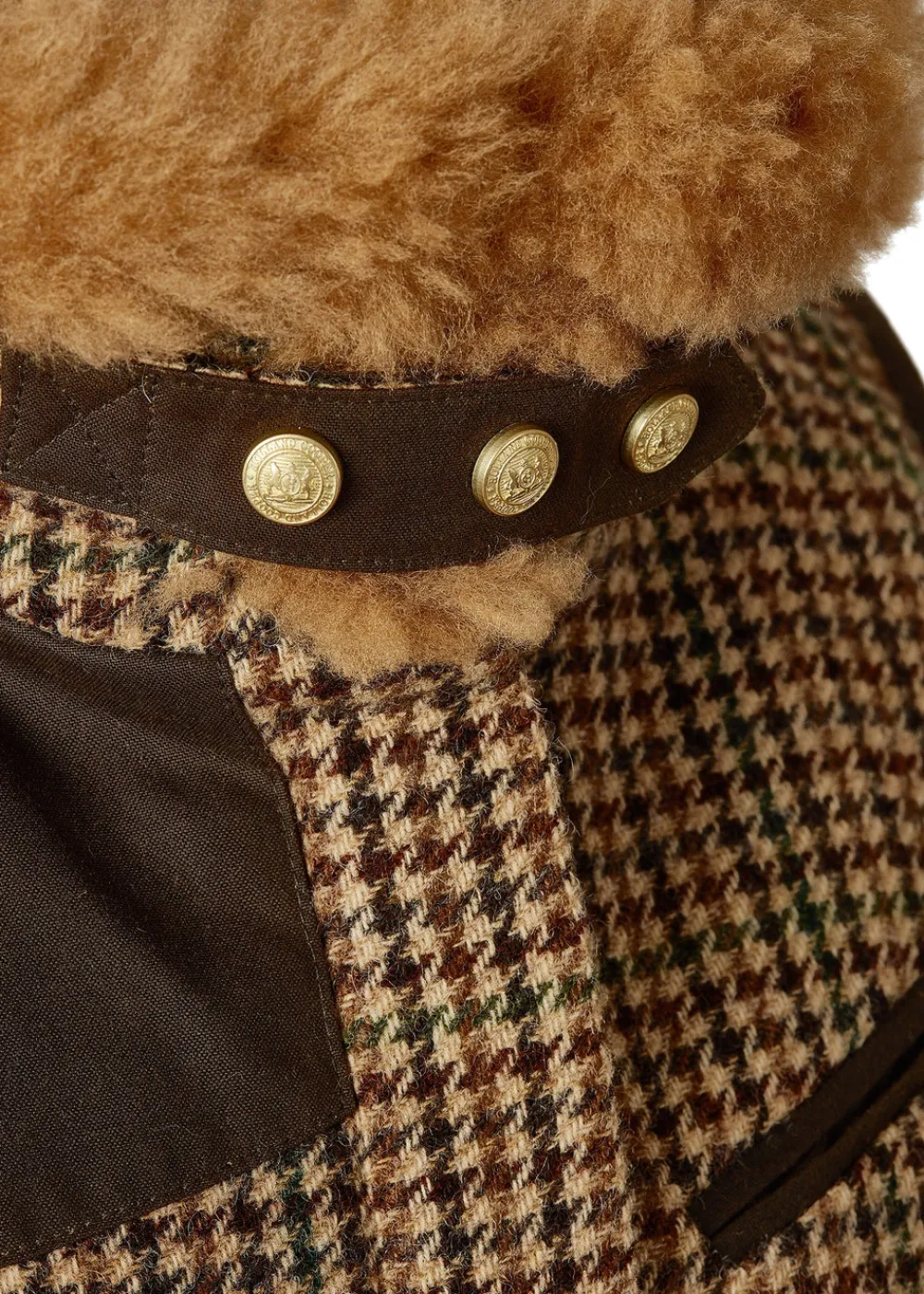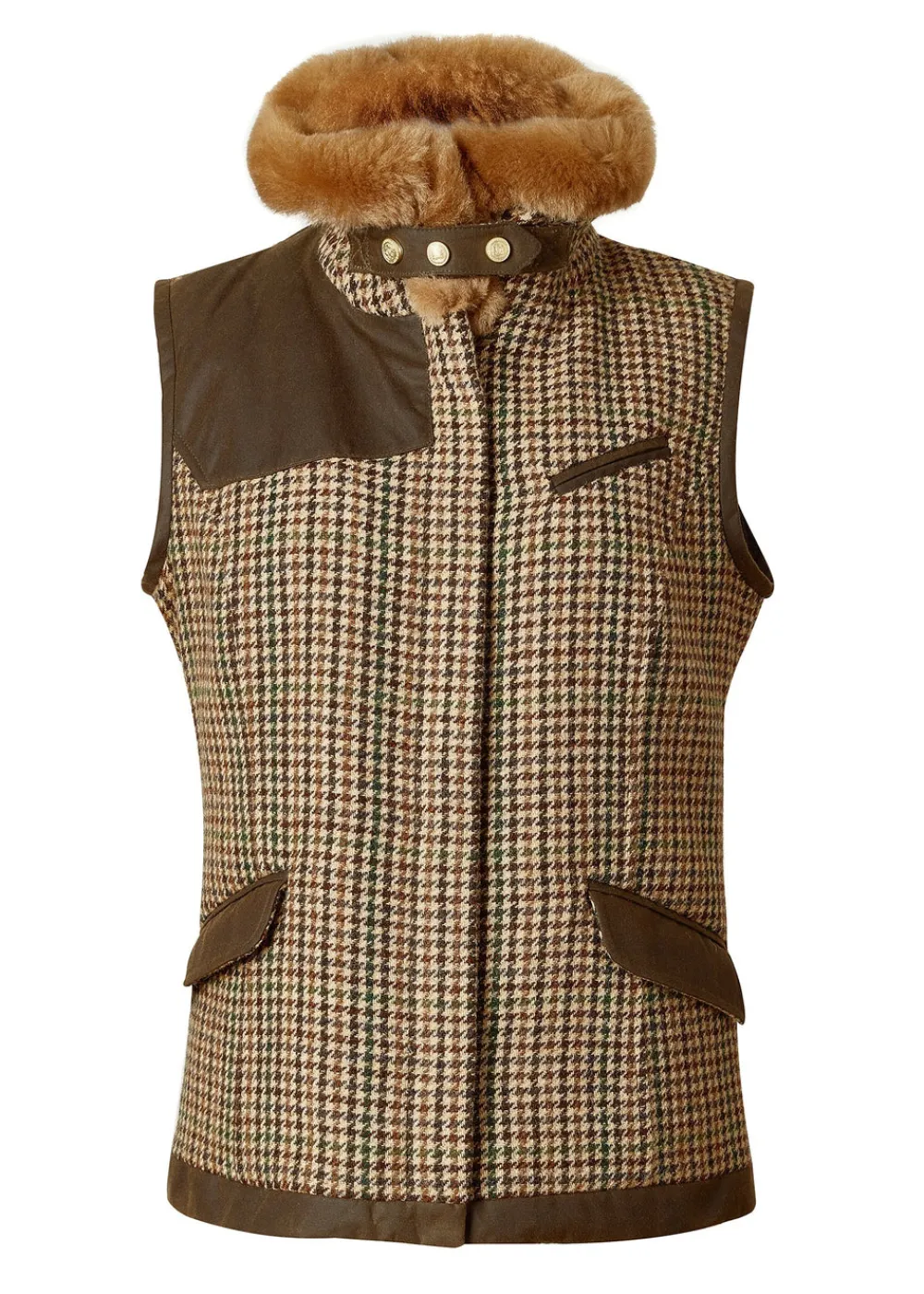 This wool gilet is a remake of one of our traditional HC heritage pieces inspired from our archive. Cut to enhance your silhouette with a flattering fitted shape, draping down at the back for an elegant look. Trimmed with British Millerain wax and shearling for added style, warmth and practicality. Made from the finest UK woven wools, this garment has been hand cut and made in England.
