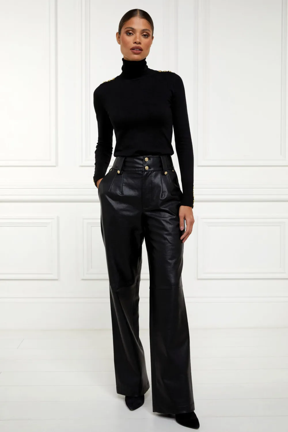 Our high-waisted PU trousers are a sophisticated addition to your wardrobe. Featuring a high-rise waist and a straight, loose-fit leg, offering a chic and modern silhouette. The pleated front adds a touch of femininity and fluidity, while the deep, flattering waistband ensures a comfortable and secure fit. Crafted from soft and subtle faux leather, these trousers provide a luxurious look and feel. Adorned with our signature gold hardware, they can elevate any outfit. Perfect for any occasion, these trousers combine style and comfort effortlessly.