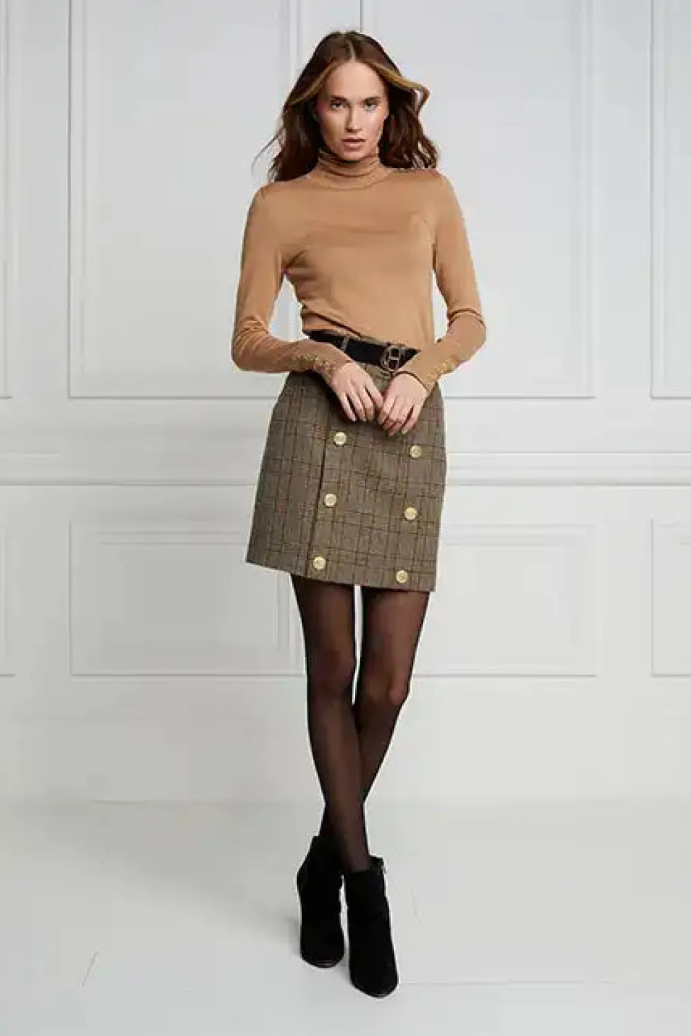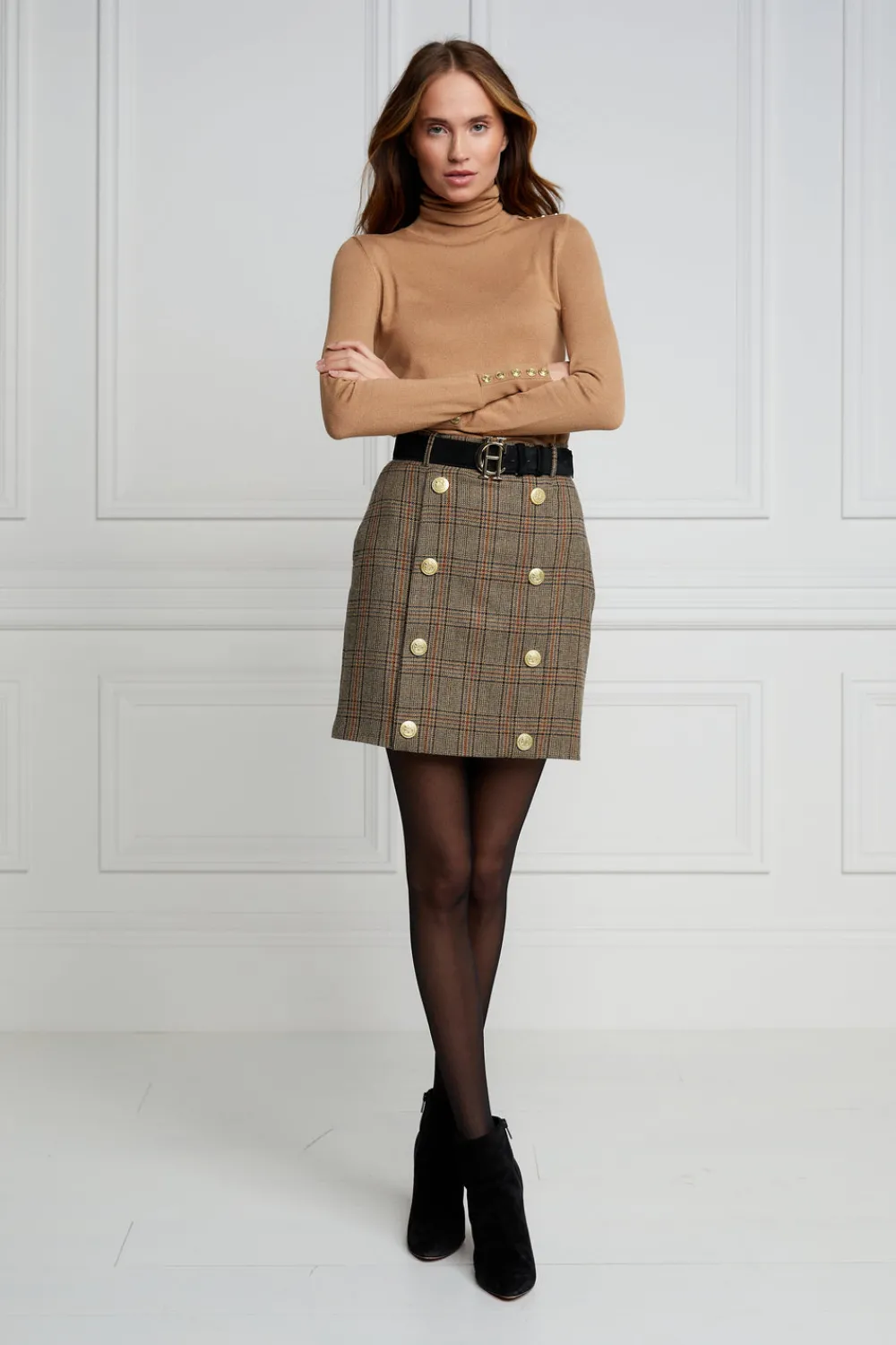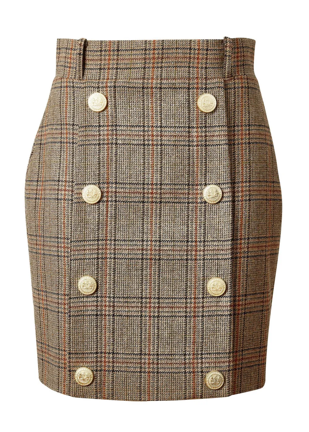 This mini style pencil skirt is fully lined and cut for a close fit from wool accented by gold rivets engraved with the classic HC crest. Tuck your sweater or blouse into the sculpting high-rise waist for an extra stylish look and feel.