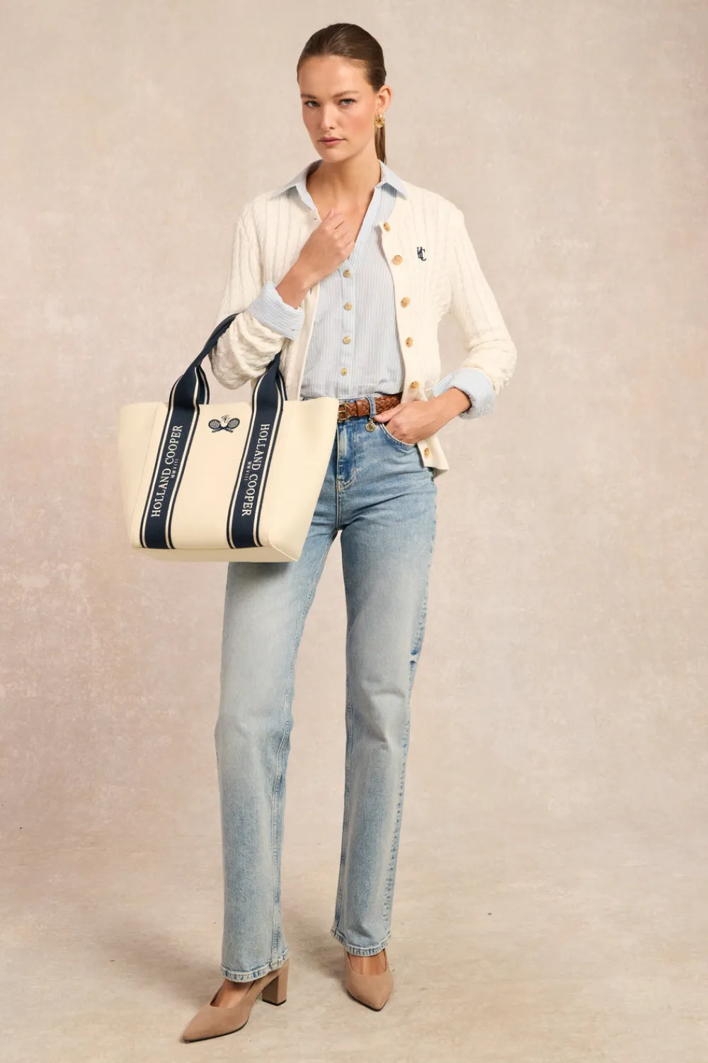 Meticulously crafted from premium cotton canvas, this structured shopper embodies our commitment to understated luxury. The distinctive contrasting webbing straps showcase our heritage through sophisticated branded embroidery, while a touch of sporting elegance elevates the design. Immaculately finished with our signature branded internals, this refined accessory seamlessly transitions from centre court to city streets.