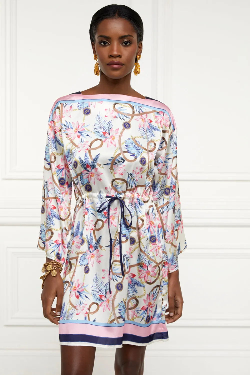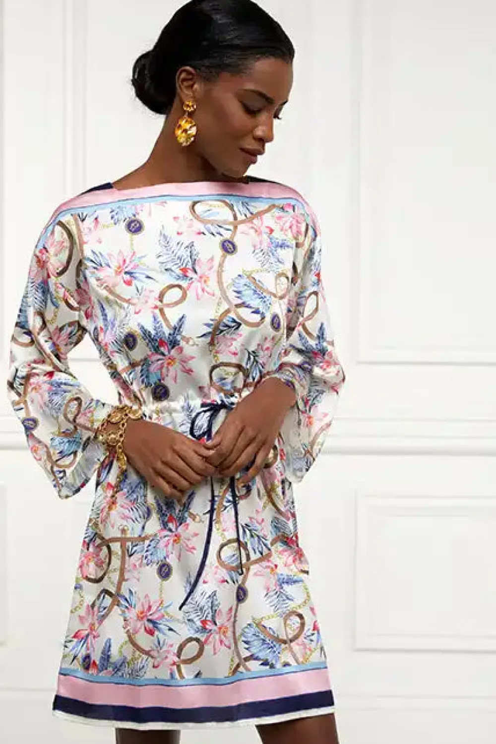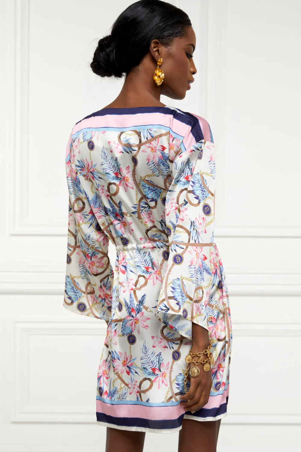 Designed with a chic, mini-length with statement bell sleeves, this dress is a must-have for the season. With a relaxed fit, the tie waistband allows for an adjustable fit. Elevated with a hand-drawn print across the silhouette.